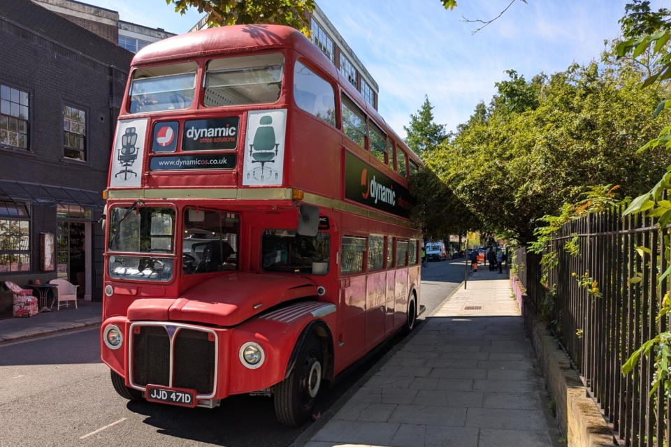 The Dynamibus is a classic 1966 Routemaster double-decker bus that has been transformed into a mobile showroom. Neil and his team will have it parked just outside the building, showcasing a wide variety of cutting-edge furniture, including ergonomic chairs, soft seating, and sit-stand desks.