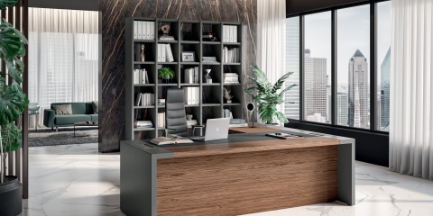 The veneered wood lacquered panelled or wooden legs and the top with leather inlays embellish the executive model. Where other functional accessories, like the metal cable holder door, make the desk practical to use without undermining formal aesthetics.