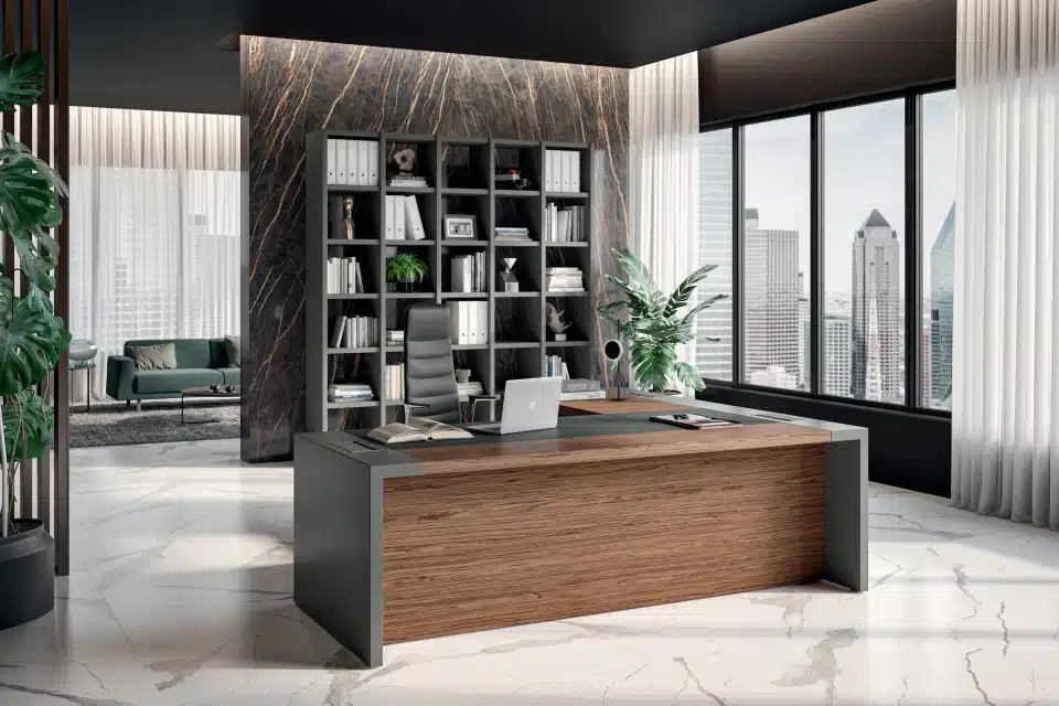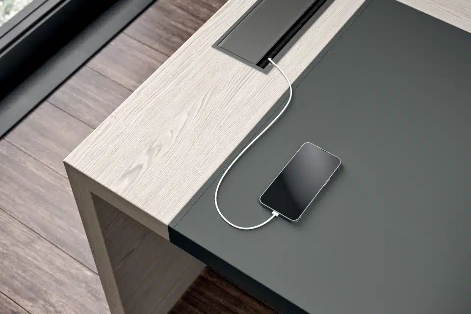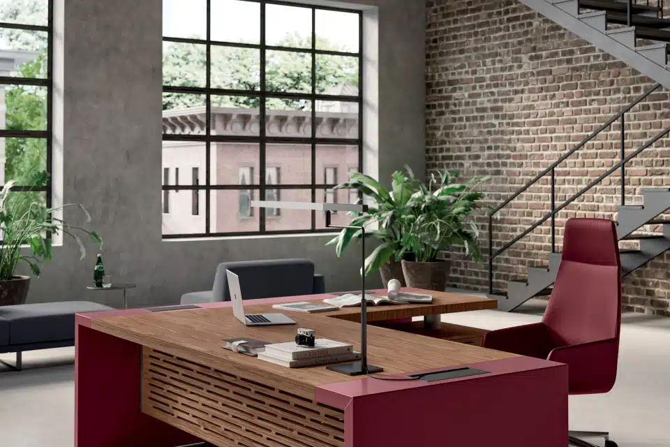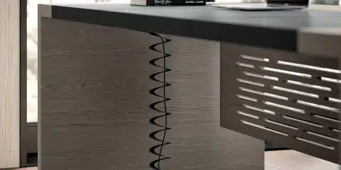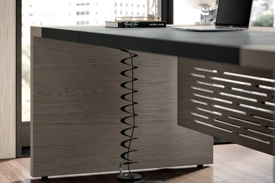The veneered wood lacquered panelled or wooden legs and the top with leather inlays embellish the executive model. Where other functional accessories, like the metal cable holder door, make the desk practical to use without undermining formal aesthetics.
