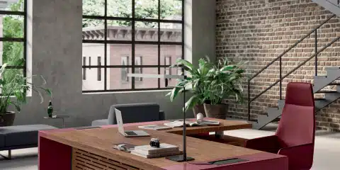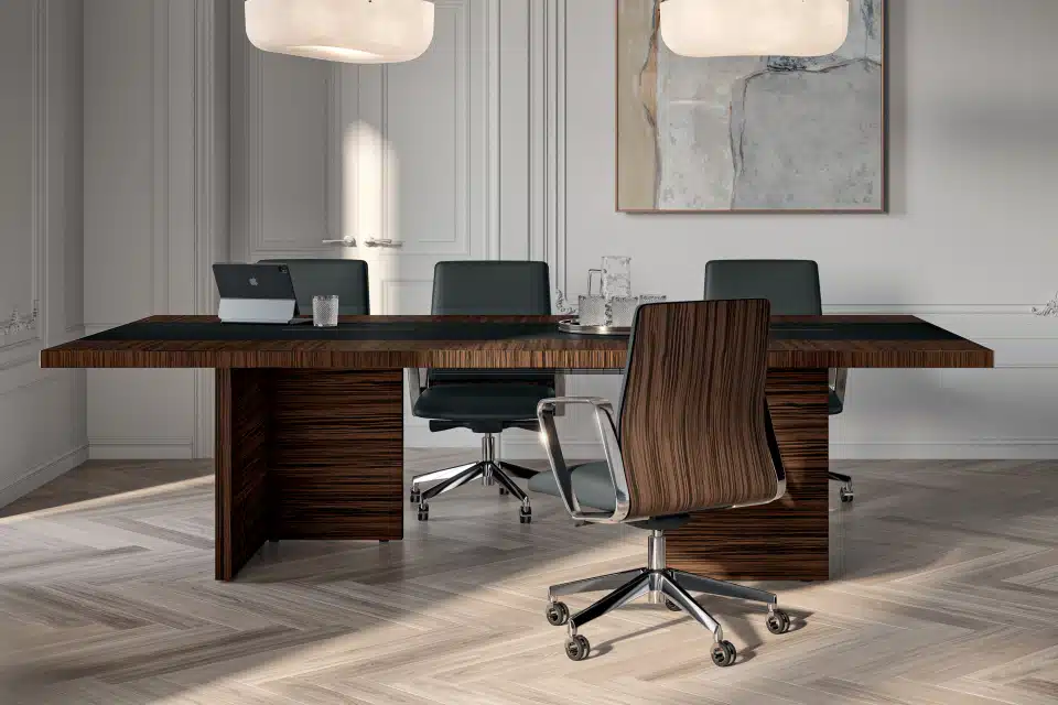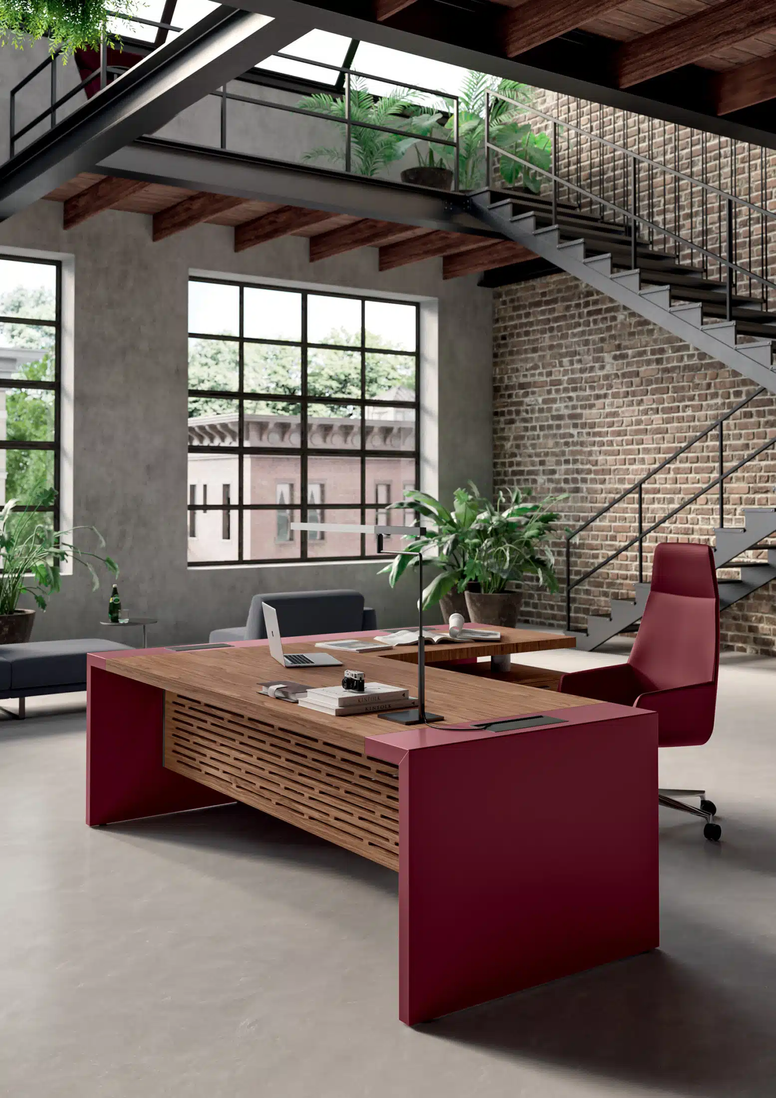 The evolution of the X10 line, with some modifications to shapes and finishings. The desk has a variety of customisation possibilities, such as lacquered or veneered panel legs. Some desk models also have a leather inlay.