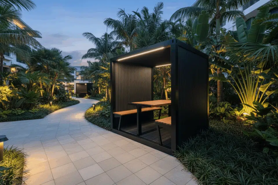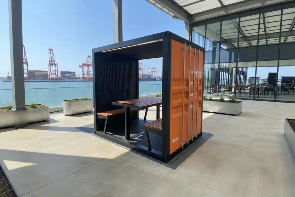Constructed with aluminium and high-quality, weatherproof recycled materials, this product features a distinctive shipping container-themed exterior with galvanised steel bars.