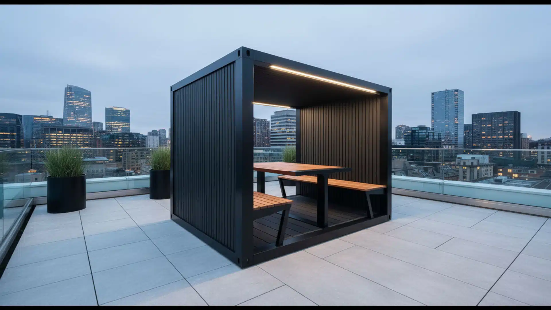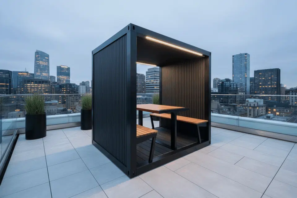 Inside, it boasts composite wood-effect slatted panels and wood-effect deck board flooring. Designed for durability, it can withstand any outdoor environment while maintaining a sleek, modern appearance that embodies a unique Container Shack aesthetic.